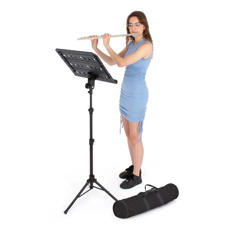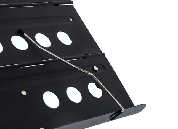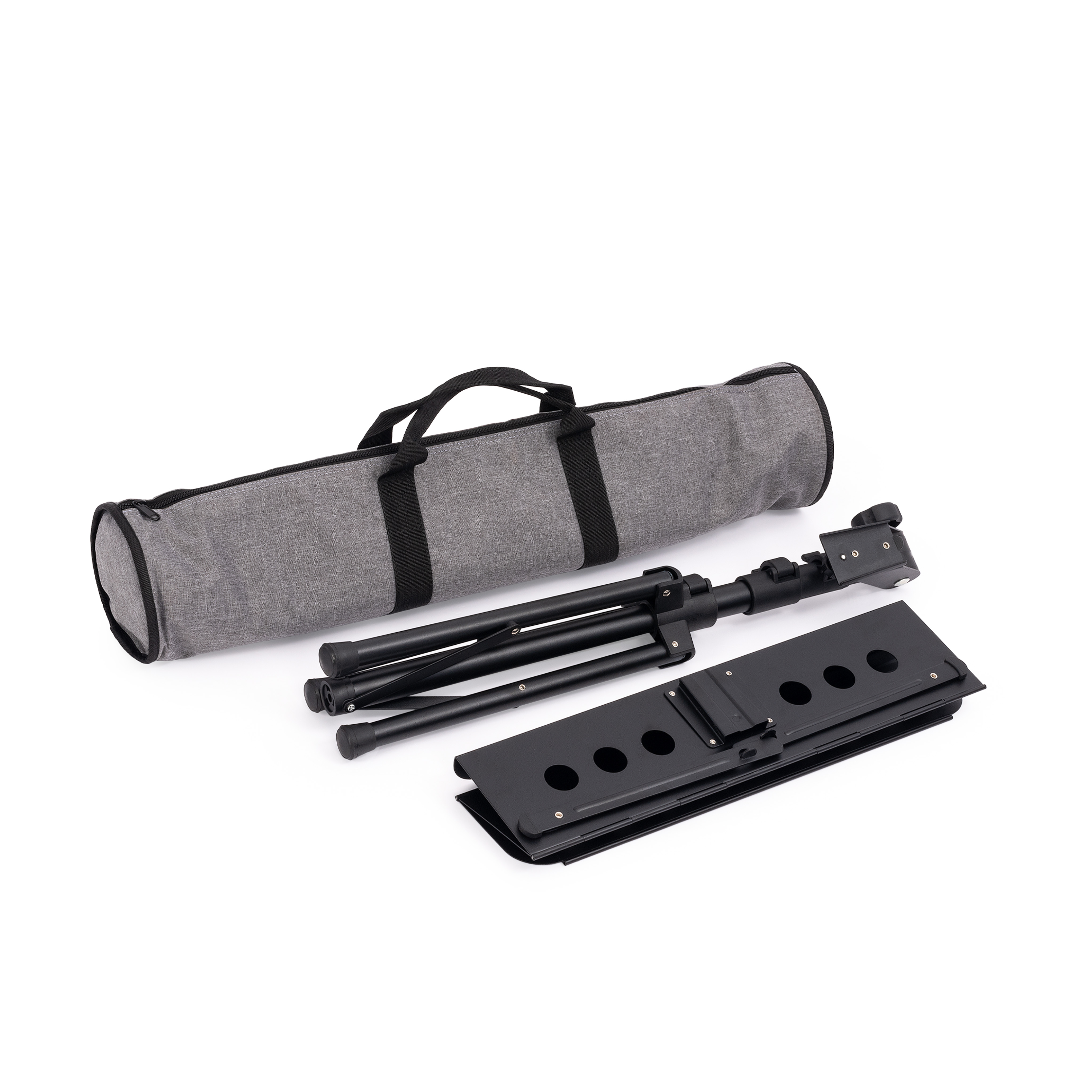 A three-part collapsing desk, with two rotating spring-loaded positioning arms, folds compactly for placement in the high-quality carry bag, ensuring convenient transport and organised storage. This model suits musicians who move regularly between classrooms, studios and stage environments.